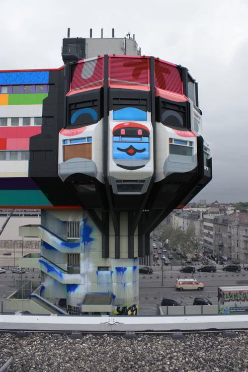 The TURMKUNST project in Berlin has just finished and now the biggest Teddy Trooper mask on the tower is watching all over the Berlin skyline. Size? 3"? 10"? No, it is 160ft (50 meters) high. Massive! The artists HONET, SOZYONE, Craig KR Costello aka KRINK and FLYING FÖRTRESS spent more than 6 weeks to turn the infamous "Bierpinsel" tower into this huge artwork. More photos on Flying Förtress' blog.